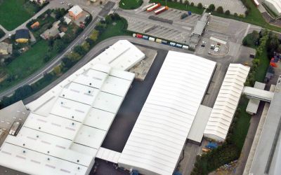 Lagerhalle, 50 m x 140 m x 7 m, mit Verbindungsgang und seitlich auskragendem Dach für Renault in Novo mesto, Slowenien.